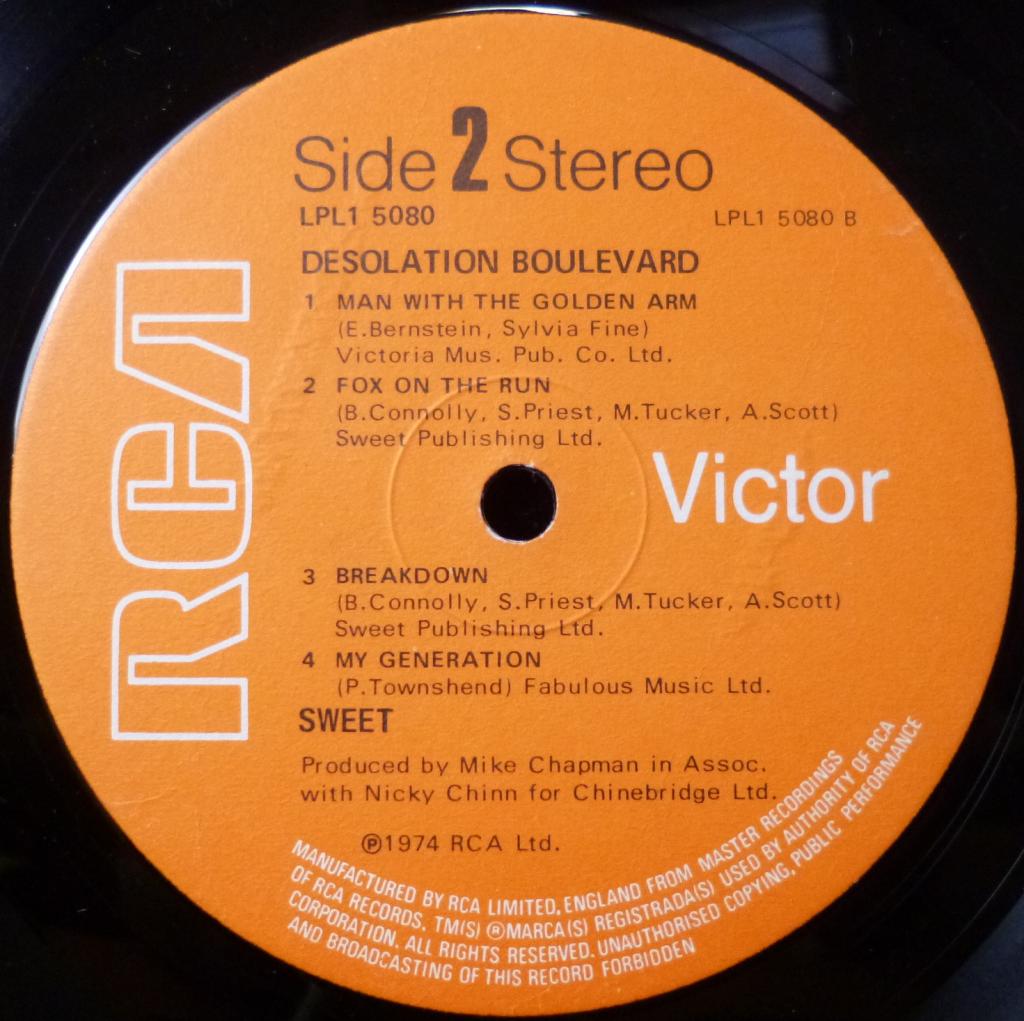 "Desolation Boulevard" - третий альбом английской Sweet, выпущенный в 1974 году компанией RCA Victor. Это был уже второй в 1974 году альбом, запущенный вслед за "Sweet Fanny Adams". Второй альбом свободных Sweet, вырвавшихся из-под опеки Никки Чинна и Майка Чапмэна. В нем только одна - первая вещь "The Six Teens" - сочинена продюссерским дуэтом. Необходимо сразу различить два издания "Desolation Boulevard": английское и американское. Это фактически, два разных альбома. Поскольку предыдущий альбом "Sweet Fanny Adams" (1974) в США не выпускался, RCA включила из него пять песен в американскую версию "Desolation Boulevard". В данном случае, мы имеем английскую версию "Desolation Boulevard". Самый большой хит в альбоме и исключительно собственный продукт - "Fox on the Run" стала одной из самых популярных песен Sweet, которую впоследствии перепевали многие известные исполнители, в том числе Scorpions, Red Hot Chilly Peppers и др. Sweet записали две версии, сильно различающиеся по звучанию. В альбоме звучит оригинальный вариант, более хард-роковый, записанный Майком Чапмэном. Для сингла Sweet переписали песню по-своему и сами же продюссировали ее, наложив больше ревера, голосов, сделав звучание более попсовым. Gatefold. In shrink.