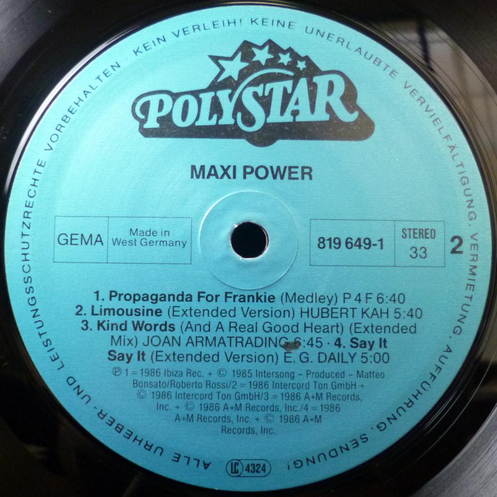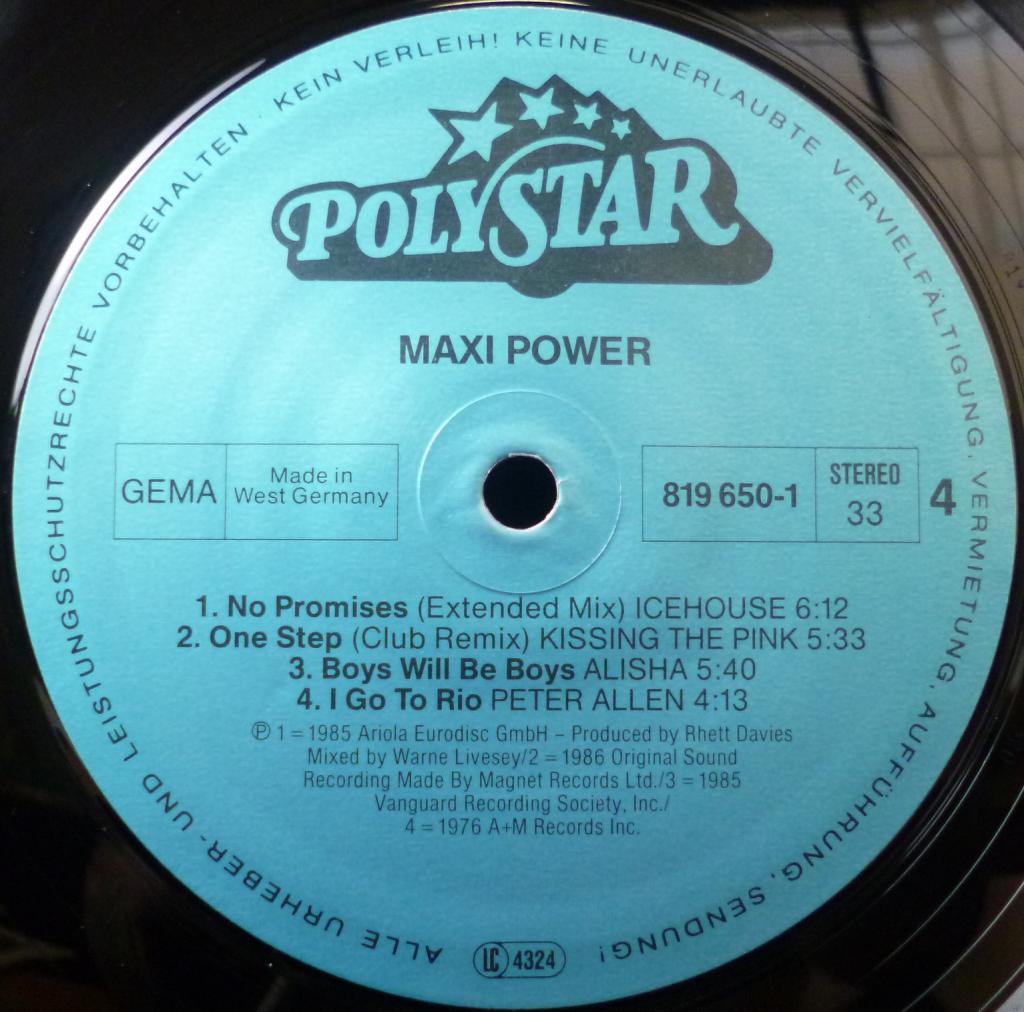 2. A2 Janet Jackson– What Have You Done For Me Lately (Extended Mix) 3. A3 Trio Rio– New York - Rio - Tokyo (Dance Mix) 4. A4 Laid Back– C.C. Cool 5. B1 P4F– Propaganda For Frankie (Medley) 6. B2 Hubert Kah– Limousine (Extended Version) 7. B3 Joan Armatrading– Kind Words (And A Real Good Heart) (Extended Version) 8. B4 E.G. Daily– Say It Say It (Extended Version) 9. C1 Level 42– Lessons In Love (Extended Version) 10. C2 J.M. Silk– Shadows Of Your Love (House Mix) 11. C3 The Communards– Disenchanted (Extended Version) 12. C4 Sista Spliff– Street Baby 13. D1 Icehouse– No Promises (Extended Mix) 14. D2 Kissing The Pink– One Step (Special Club Remix) 15. D3 Alisha– Stargazing (Extended Dance Mix) 16. D4 Peter Allen– I Go To Rio |