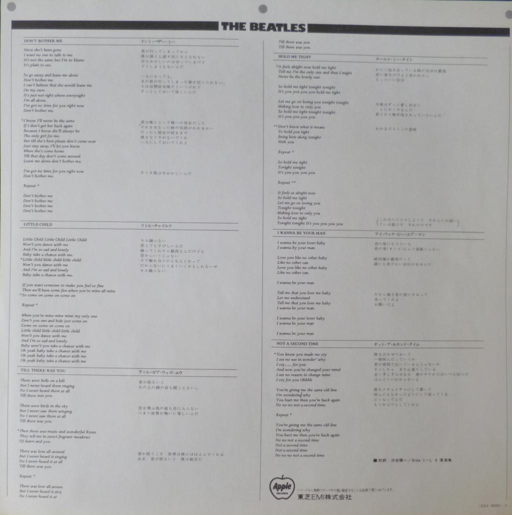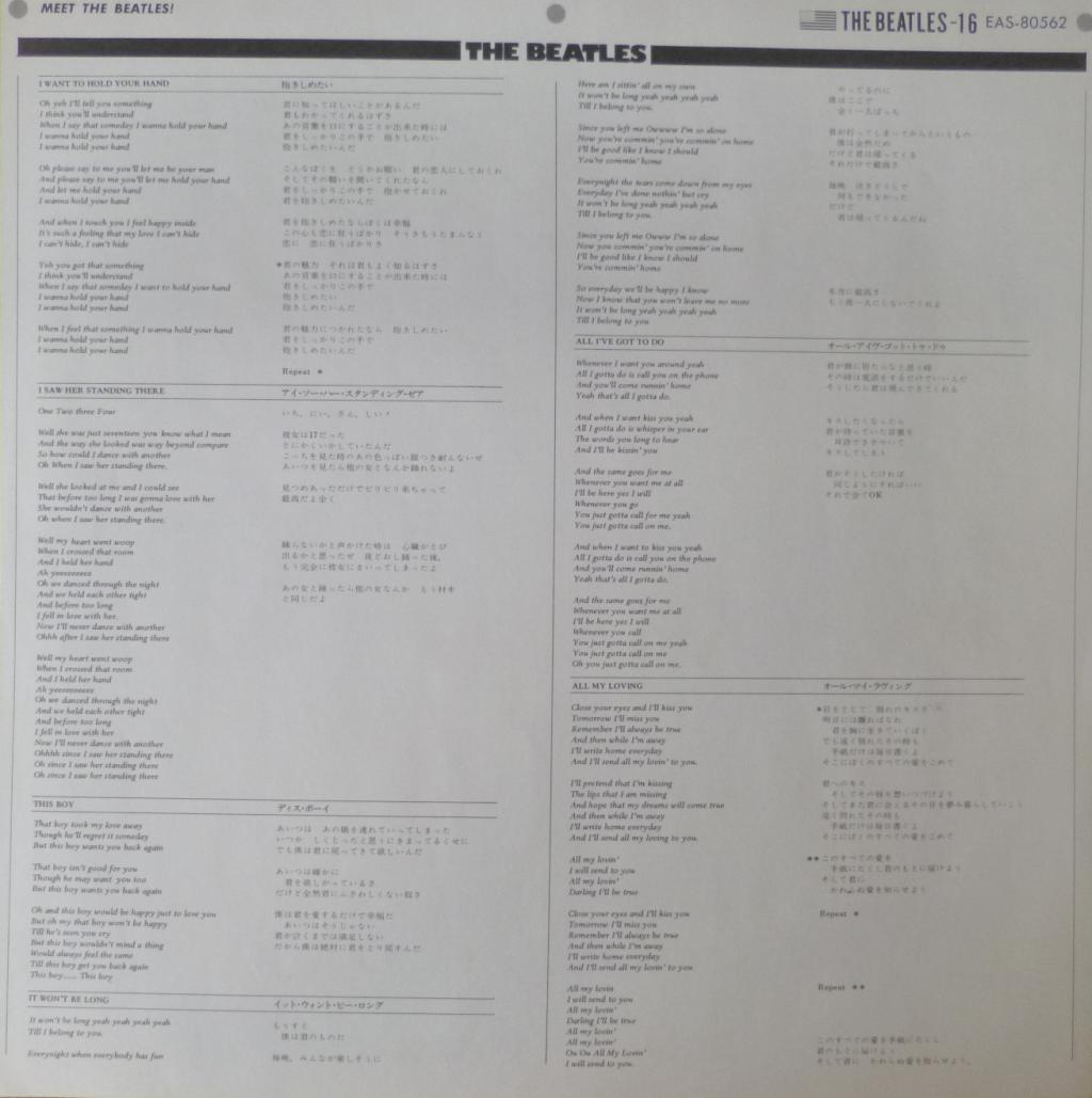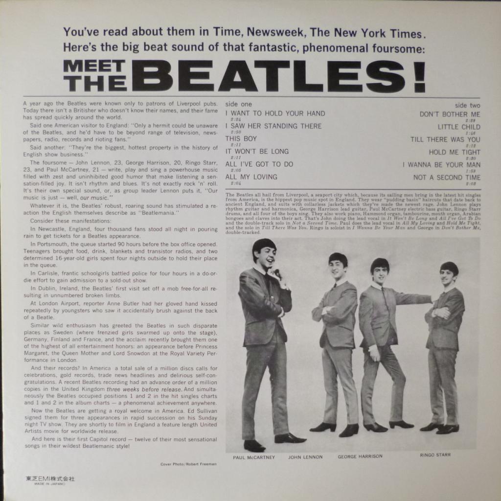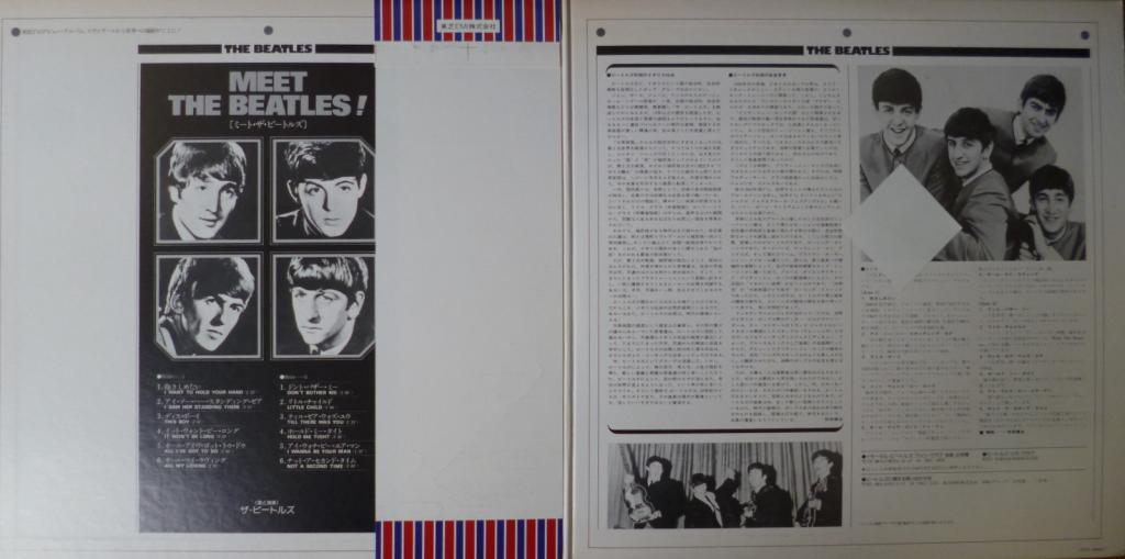 "Meet The Beatles!" — второй альбом The Beatles, выпущенный в США, Канаде, странах Южной Америки и Японии (хотя на обложке он представлен как первый). Диск вышел 20 января 1964 года, спустя лишь десять дней после того, как чикагский лейбл Vee-Jay Records выпустил " The Beatles", пролежавший на полке с предыдущего лета. 15 февраля 1964 года альбом поднялся на 1-е место в США и возглавлял хит-парад в течение 11 недель. До сих пор этот рекорд — для исполнителей популярной музыки — остается непревзойденным. Пластинка содержит несколько треков из "With the Beatles" и имеет сходное оформление. Исключенными из списка оказались, однако, "You Really Got a Hold on Me", "Devil in Her Heart", "Money (That’s What I Want)", "Please Mister Postman" и "Roll Over Beethoven". Они вошли во второй битловский альбом "The Beatles’ Second Album". Два последних трека также вышли на EP "Four By The Beatles". Японский репресс выпущен в 1976-ом году. OBI. Gatefold. Insert. |