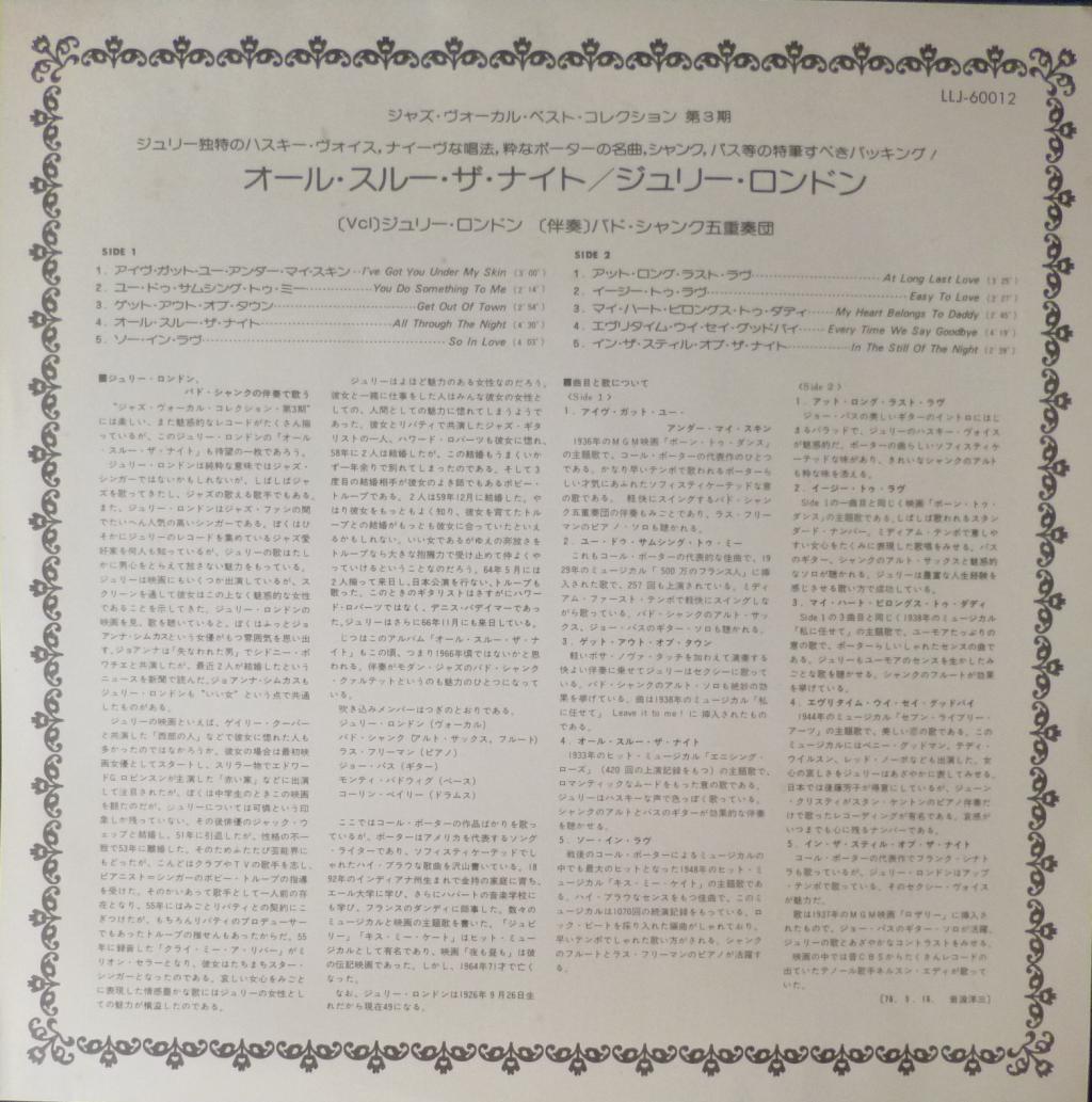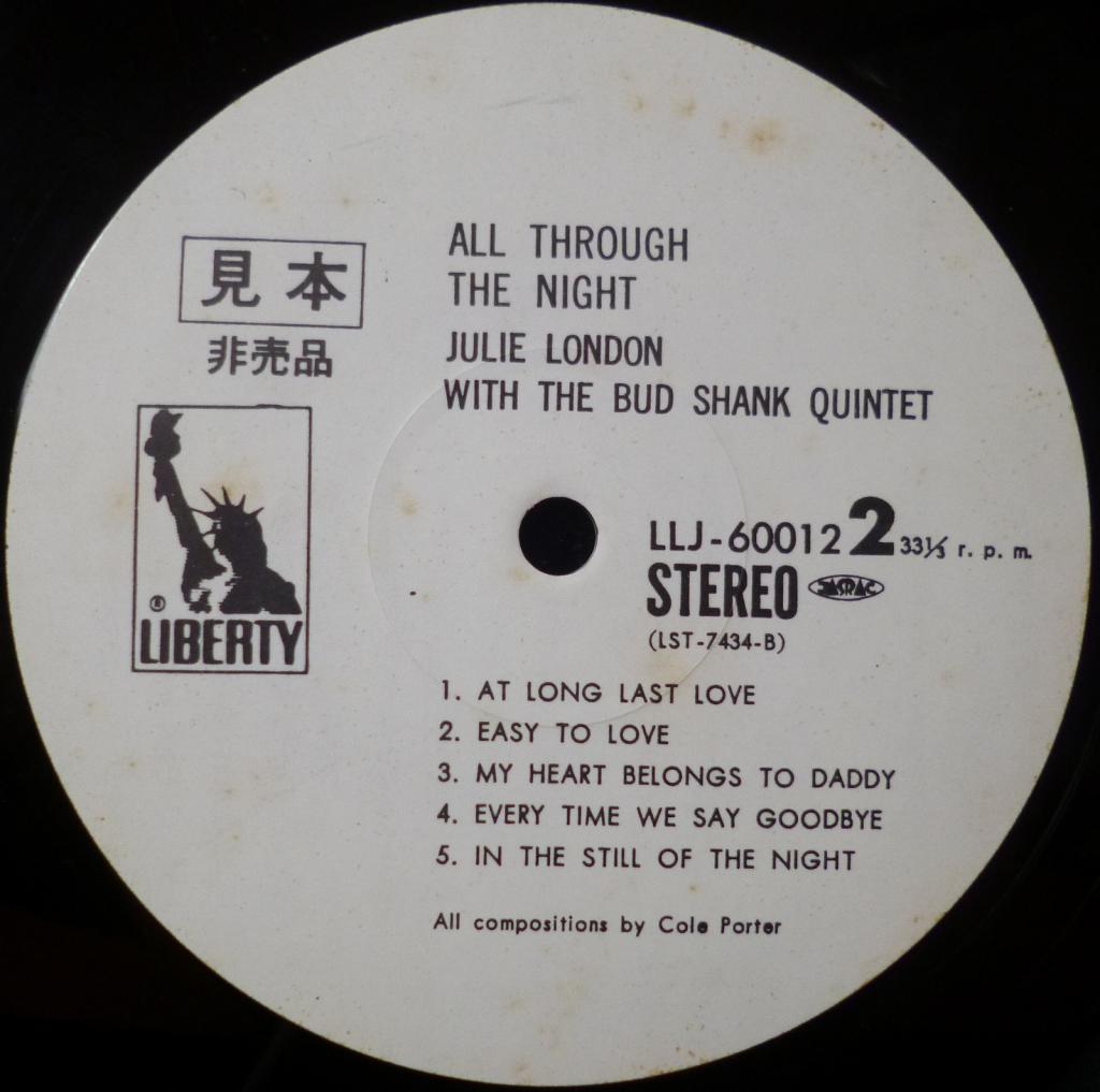 All Through the Night: Julie London Sings the Choicest of Cole PorterID : 33859 Стиль: Pop Издание: Переиздание,промо Год издания: 1976 Лейбл: Liberty Records Страна: Япония Размер пластинки: LP Состояние: nm/m Винил-код: LLJ-60012 ПОЧЕМУ ПОКУПАЮТ ИМЕННО У НАС