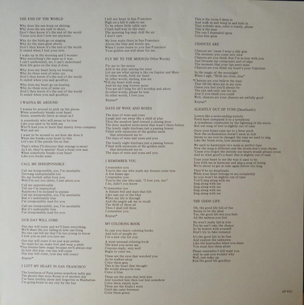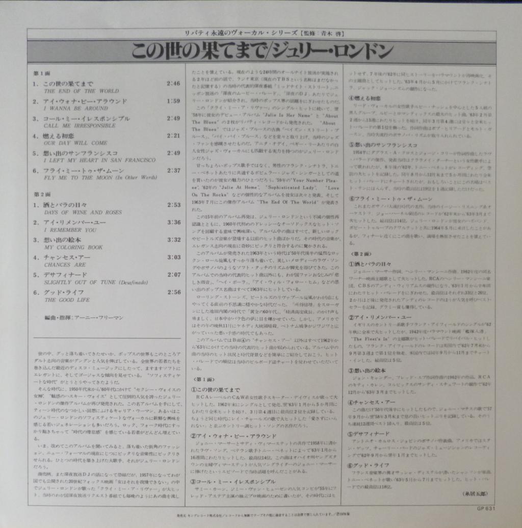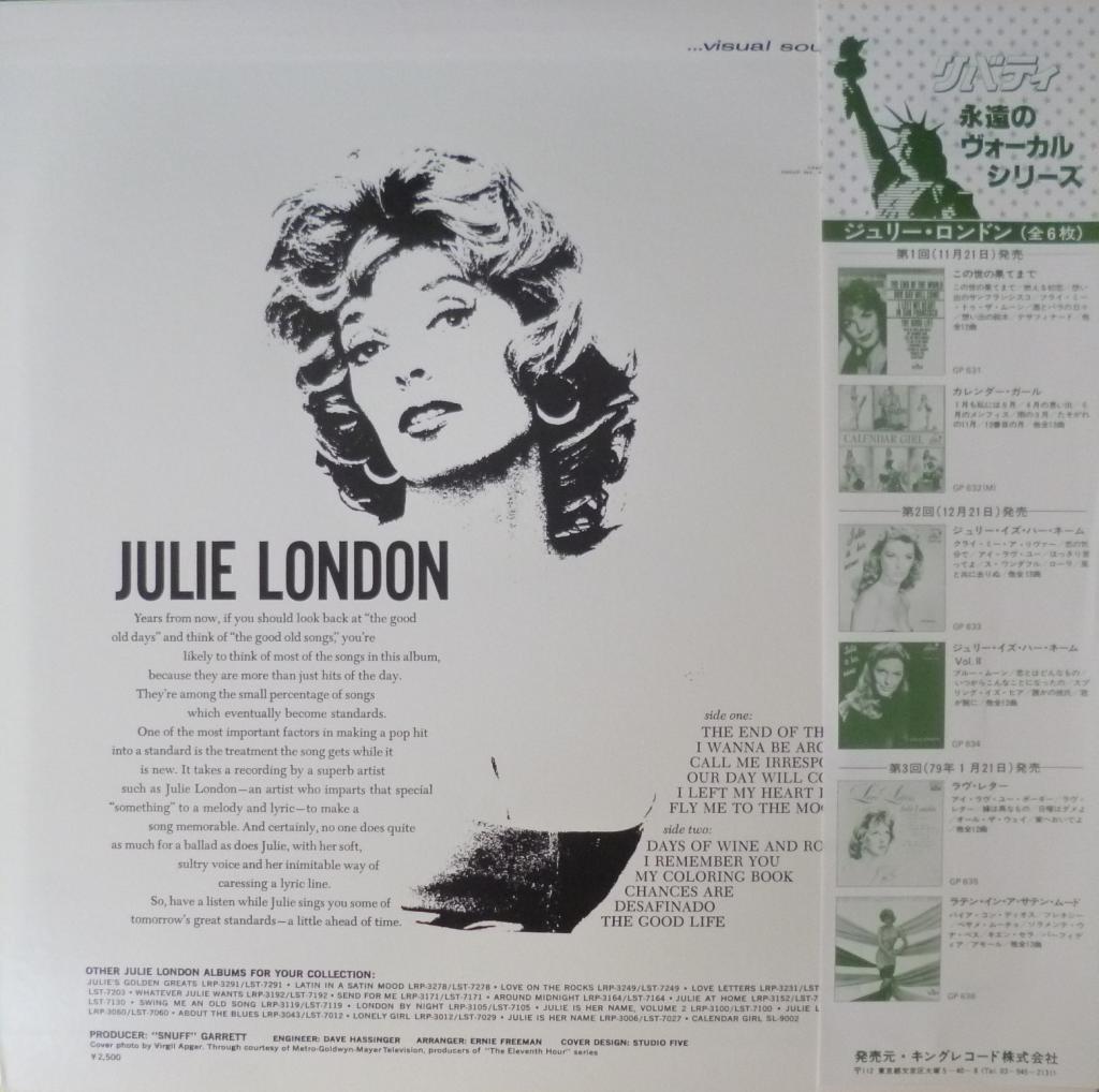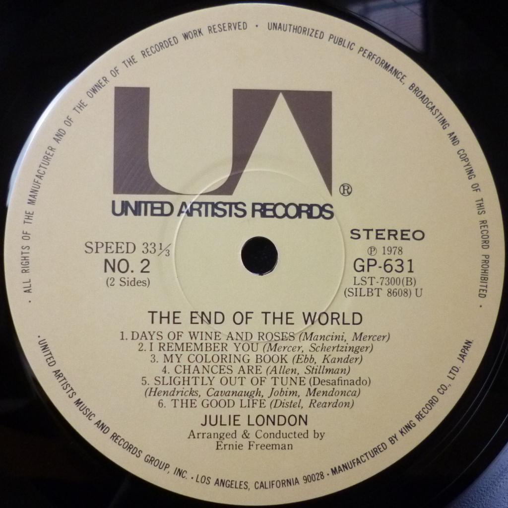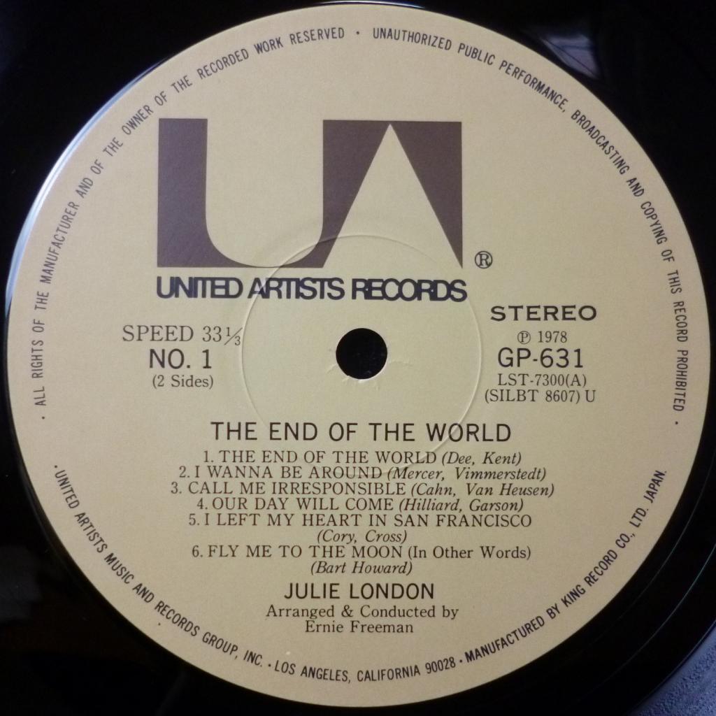 Обладательница страстного, бархатного и сексуального голоса Джулия Лондон была очень популярна в 50-е годы прошлого столетия. Она никогда не имела диапазона Ella Fitzgerald или Sarah Vaughan, нo брала слушателя тонкостью, сдержанностью, мягкостью своего пения. Певица и актриса, она снималась в кино с такими известными актерами как Gregory Peck и Rock Hudson. Самая известная песня Джулии Лондон "Cry Me a River" исполнена ей в фильме "The Girl Can’t Help It". После записи своего последнего альбома в 1969 году Лондон продолжила сниматься в сериале "Emergency" в 1974-1978 годах на NBC. Несмотря на образ секс-символа, Лондон известна своими сексуальными обложками к альбомам, которые становились предметом коллекционирования, а она была на удивление застенчива и оставила шоу-бизнес в конце 70-х годов. Каждый альбом несравненной Джулии Лондон является прекрасным образцом качественной американской поп-музыки полувековой давности. "The End of the World" — альбом, выпущенный в июне 1963 года. Аранжировщиком и дирижёром аккомпанирующего оркестра выступил Эрни Фримен. Японское переиздание 1978-го года. OBI. Insert. |