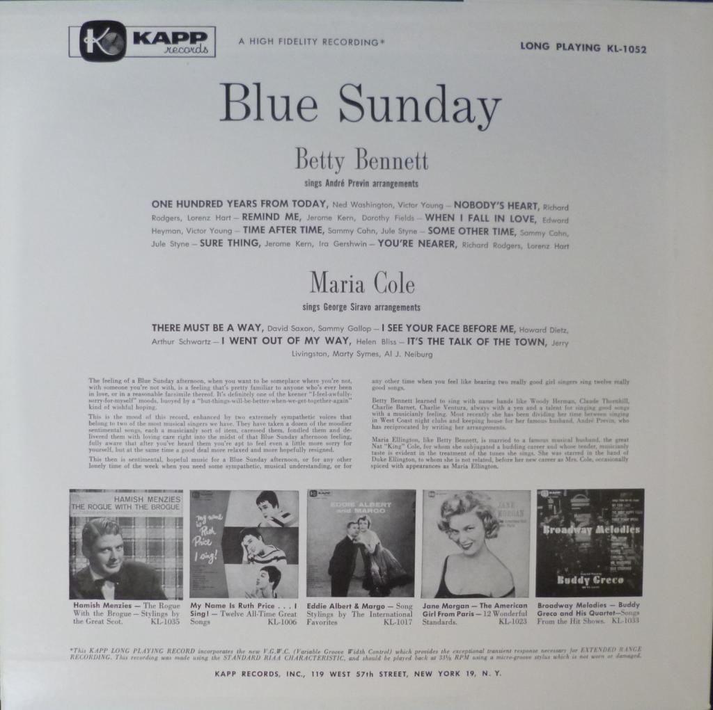 Бетти Беннетт – американская джазовая певица. Её первым серьёзным контрактом стал контракт с группой Клода Торнхилла в 1946 году, в которой играл её муж, басист Игги Шевак. Вскоре после того, как муж ушёл из группы, чтобы присоединиться к группе Альвино Рея, Беннетт последовала за ним. В 1949 году она присоединилась к группе Чарли Вентуры, а затем, в 1959 году, к оркестру Бенни Гудмена. Аранжировки её второго альбома "Nobody Else but Me" были сделаны Шорти Роджерсом и её вторым мужем, Андре Превином. Мария Коул – американская джазовая певица, жена певца Нэта Кинга Коула и мать певицы Натали Коул. Она была джазовой певицей, работавшей с Каунтом Бейси и Дюком Эллингтоном под псевдонимом Мари Эллингтон. Она познакомилась с Нэтом «Кингом» Коулом, когда они оба пели в клубе «Занзибар». "Blue Sunday" - альбом, состоящий из самостоятельных композиций обеих певиц, который был выпущен в 1957-ом году в аудиофильском качестве и переиздан в Японии небольшим тиражом в 1995-ом году. Моно. Insert. |