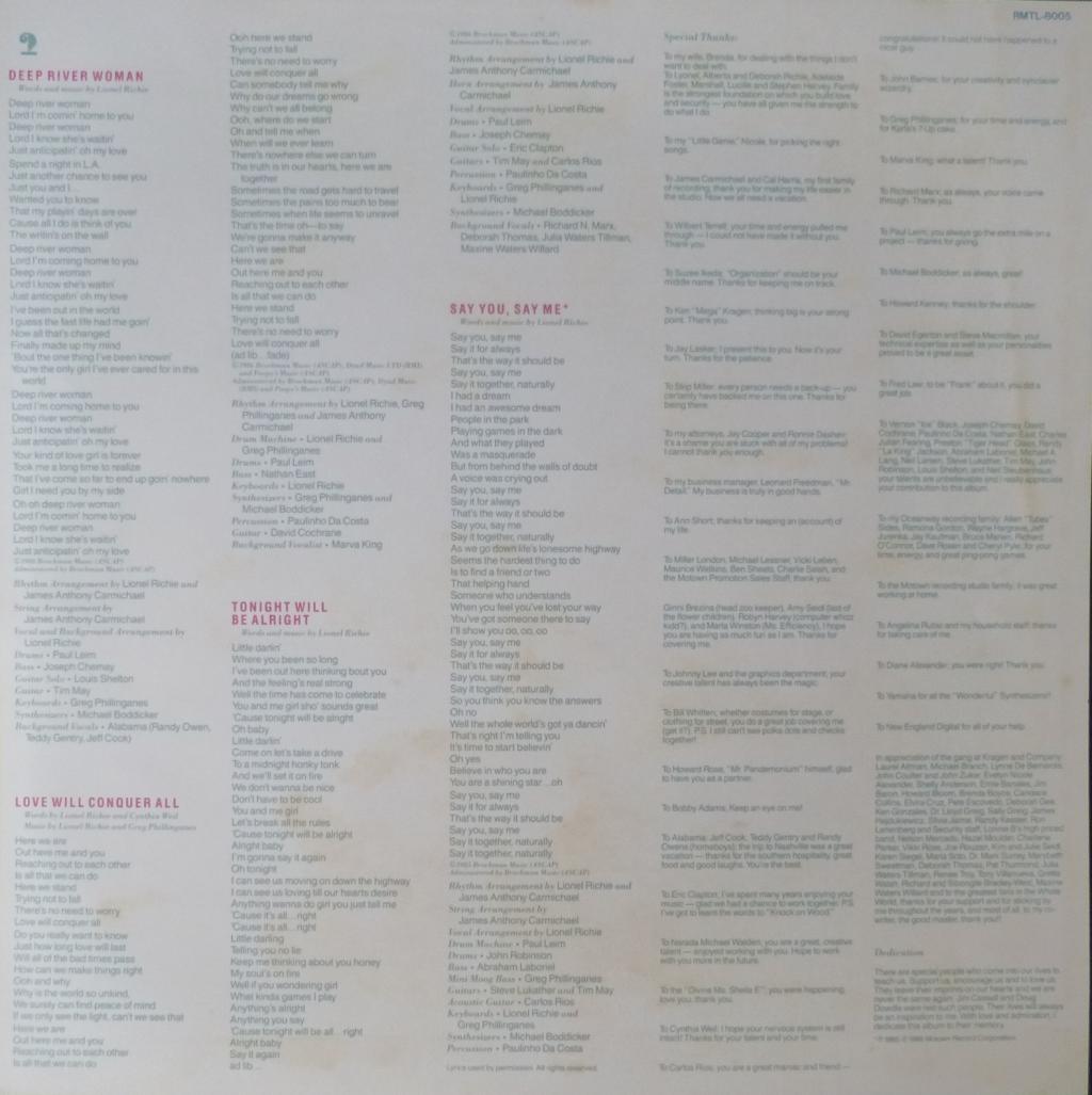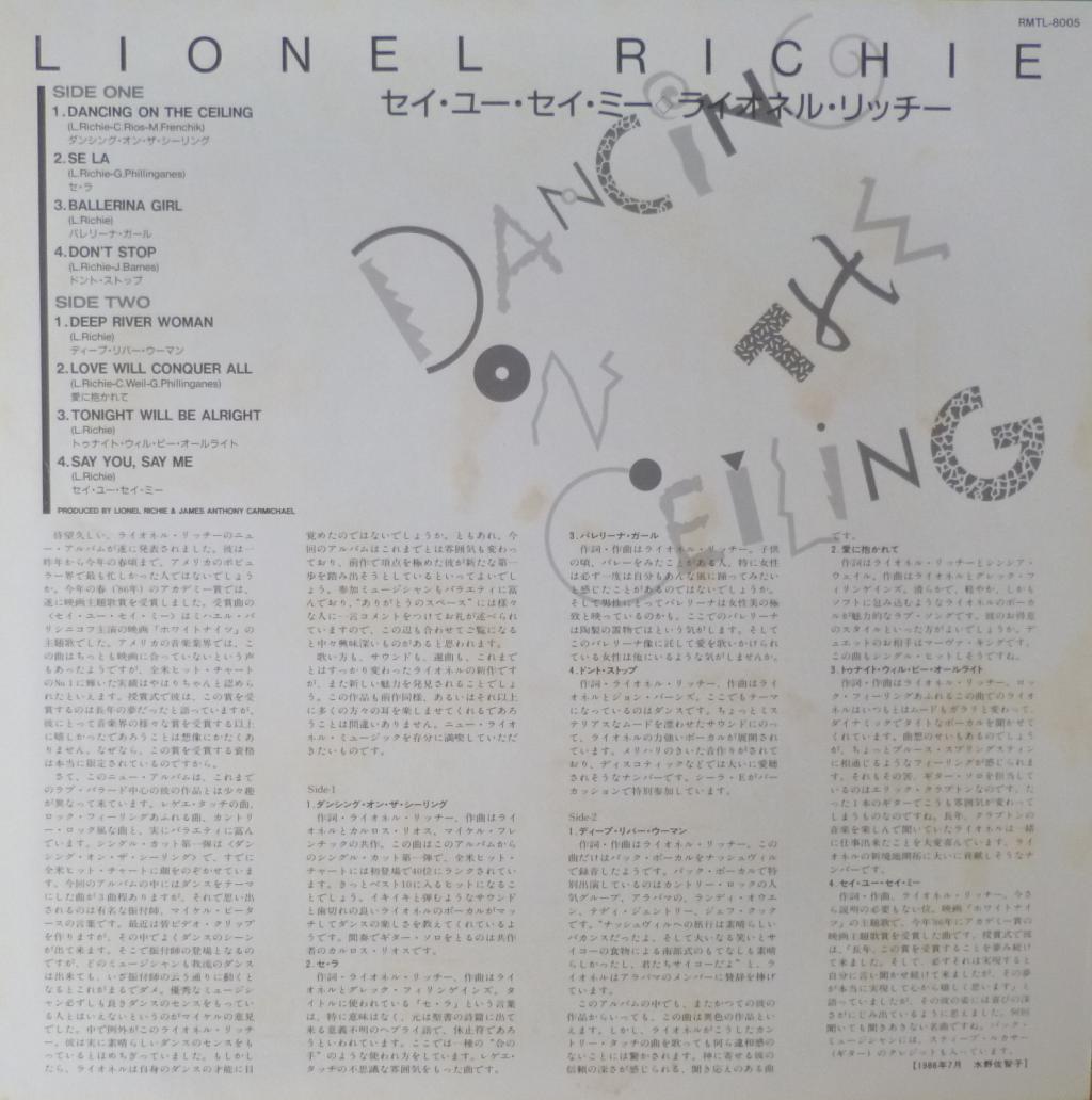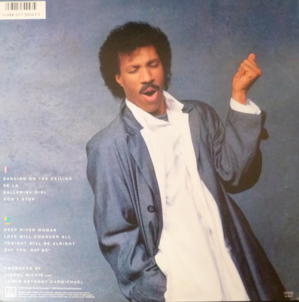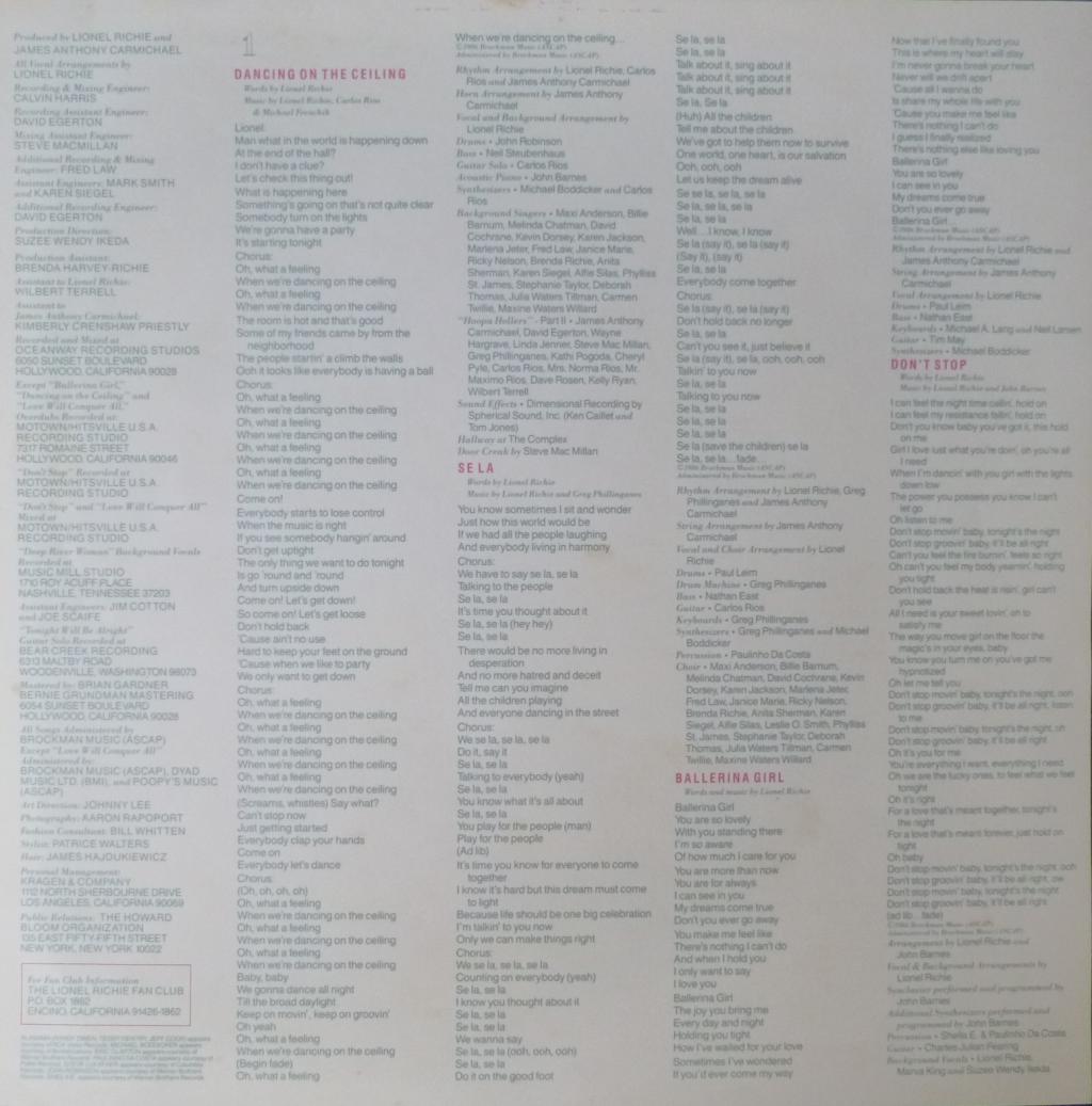 "Dancing On The Ceiling" (1986) - третий сольный альбом бывшего фронтмена популярной в 70-х годах группы Commodores Лайонела Ричи с ведущими хитами "Say You, Say Me" и "Dancing On The Ceiling". А вообще из 8 присутствующих здесь песен 6 стали хит-синглами. "Say You, Say Me" выиграл премию Оскар в номинации "Best Original Song". Альбом же занял первую позицию в США. Продажи составили более 4 млн экземпляров. Gatefold (разворот, превращающийся в постер). Insert. soc |