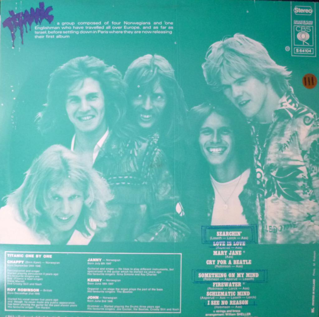 Коллектив из Осло Titanic был образован в 1969-м четырьмя музыкантами: Кьеллом Асперудом (вокал, перкуссия), Йанни Лозетом (гитара), Джоном Лорком (ударные) и Кенни Аасом (бас, клавишные). Ничего особенного команда из себя не представляла, пока к ней не присоединился вокалист-англичанин Рой Робинсон, ставший основным автором текстов. С его помощью Titanic быстро стали ведущей норвежской рок-бандой, и уже в 1970 году коллектив выступал за пределами родины. Одноименный дебютный альбом выпущен в 1970-м году совместным производством Голландии и Германии для всего европейского рынка. soc / woc |