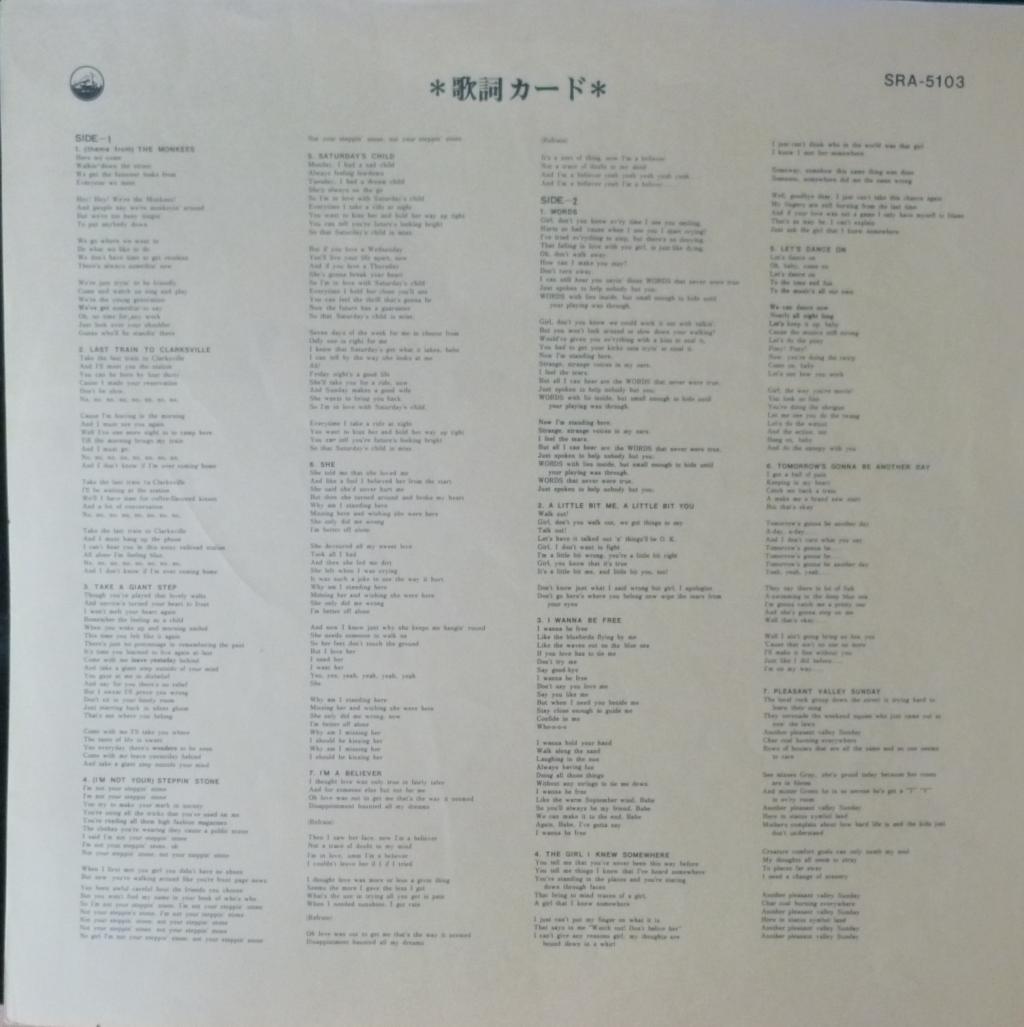 Участники группы The Monkees были впервые собраны вместе в 1965 году телеканалом NBC для съёмок в одноимённом телесериале о буднях современной рок-группы, образцом для которого послужил фильм The Beatles "Вечер трудного дня". Созданная изначально с целью участия в телесериалах, группа обрела успех в другой нише, использовав ажиотаж вокруг "британского вторжения". Она стала "американским ответом" группе Битлз. Они записали ряд всемирных хитов "The Monkees Theme", "Last Train to Clarksville", "I’m a Believer", "(I’m Not Your) Steppin' Stone", "Pleasant Valley Sunday" и "Daydream Believer". Их альбомы и синглы разошлись по всему миру тиражом более 65 миллионов экземпляров. "Golden Album" - японский эксклюзивный сборник, содержащий все хиты группы и постер! OBI. Insert. * конверт в состоянии NM- |