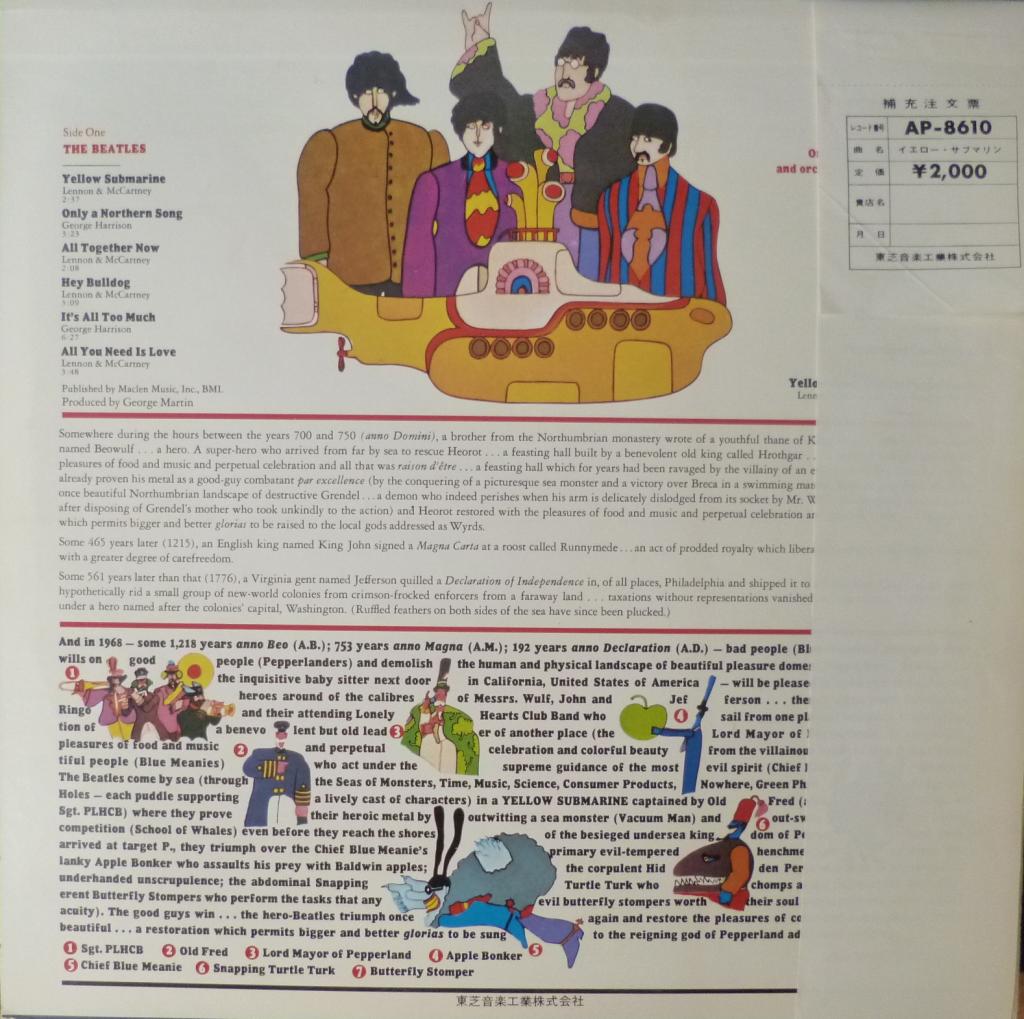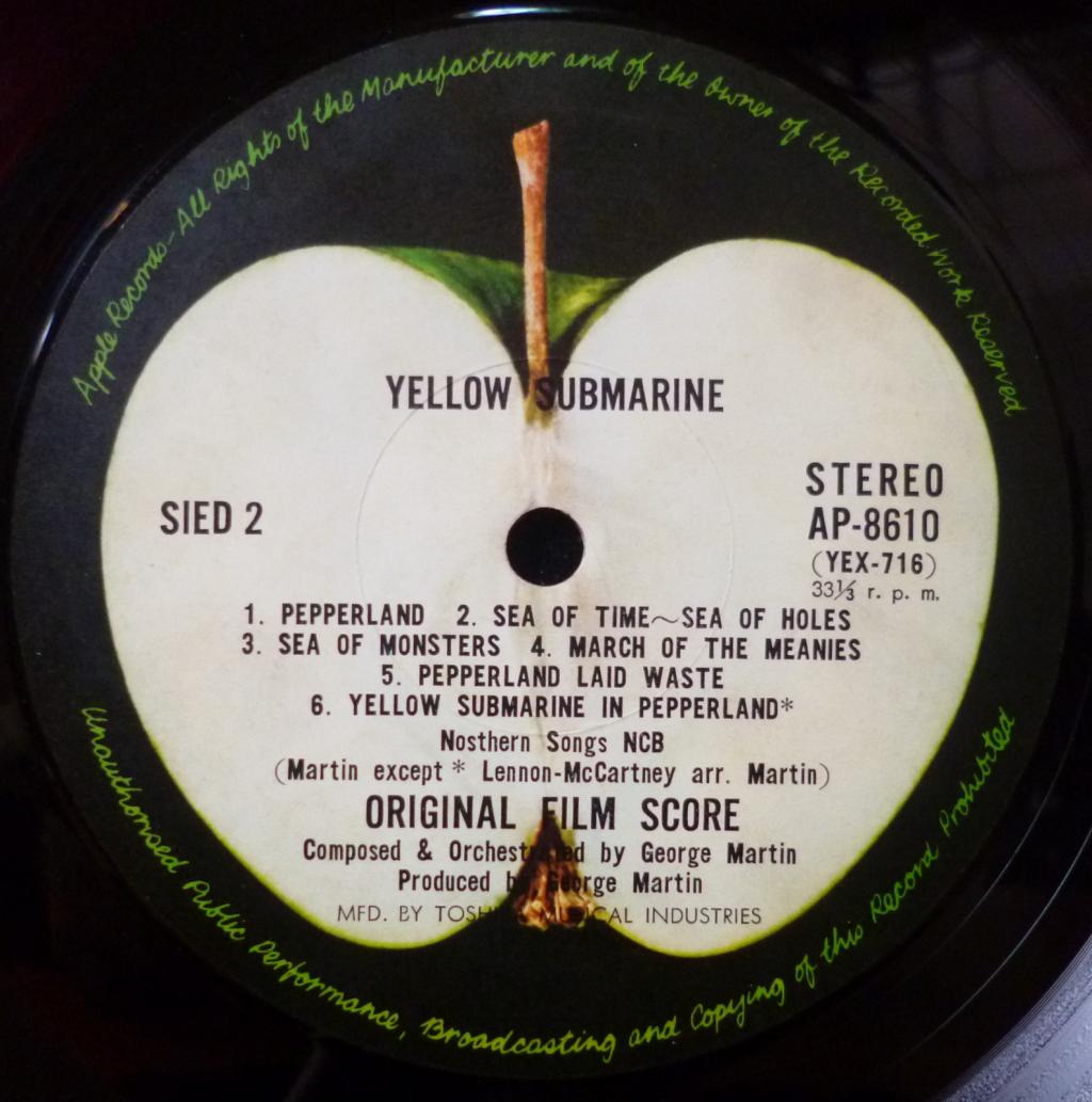 "Yellow Submarine" - одиннадцатый альбом The Beatles, вышедший в 1969 году, является звуковой дорожкой для одноименного мультфильма. В альбом вошли шесть песен The Beatles, а также семь симфонических пьес, написанных специально для мультфильма продюсером группы Джорджем Мартином. Мегараритетный японский первый пресс на прозрачном темно-красном виниле выпущен 21 марта 1969-го года. Коллекционная мечта из серии "Попробуй найди такой второй!". OBI. Insert Matrix: YEX-715 1S / YEX-716 1S  |